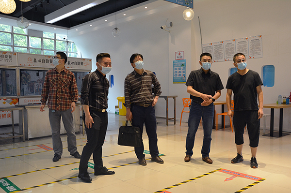 朱继平(右二)、尹家经(中)、孙细望(左一)了解食堂功能布局