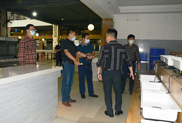 朱继平(左二)、尹家经(右一)、孙细望(左一)、郭明虎(左三)了解食堂设备配置