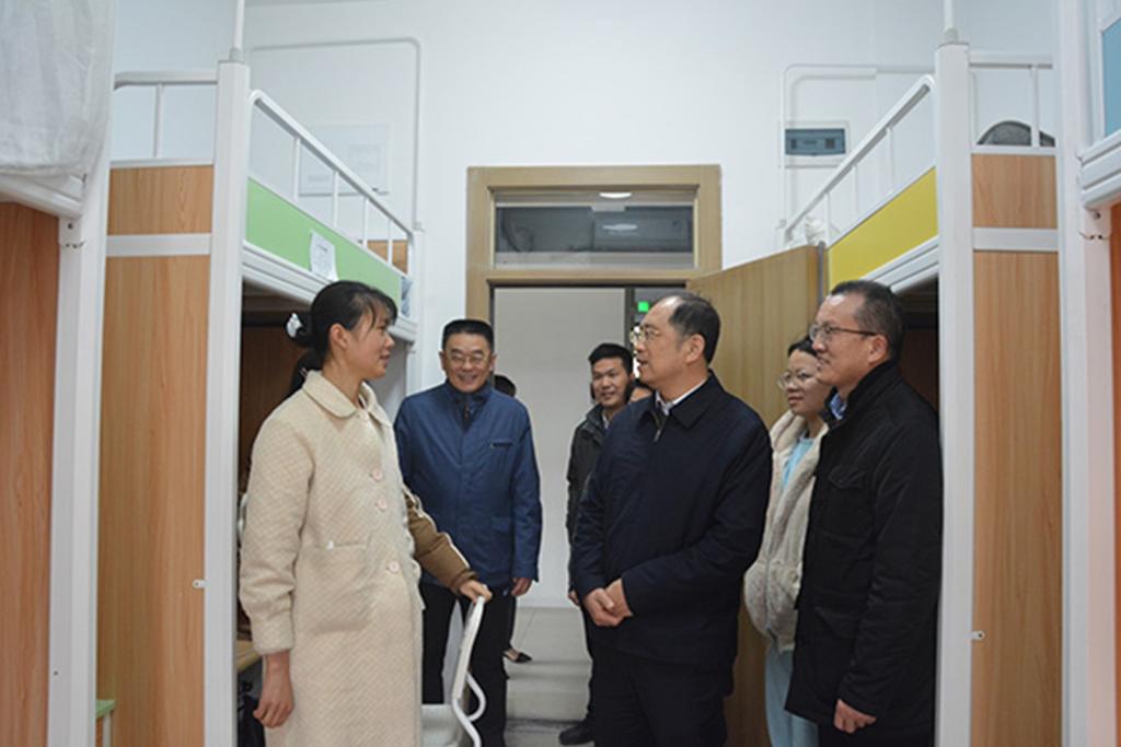 张幸平一行先后前往公司新校区图书馆、综合食堂,实地查看校园环境,听取王文凯作有关工作情况介绍,询问公司下一步工作计划和荆州大学城项目建设情况,对新校区校园环境打造、软硬件设施建设、开设专业发展规模等情况进行全面了解。张幸平一行还走进宿舍楼看望刚搬进新寝室的员工,与员工面对面交流,了解员工思想动态和学习生活情况。