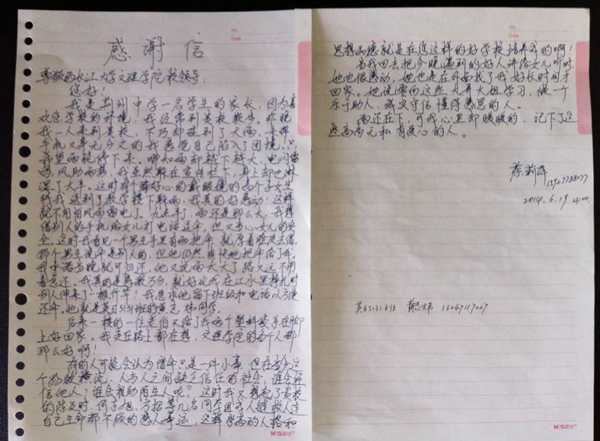 本网讯(记者 周芳)“真是感谢beat365官网中文版本的员工们,这样崇高的人格和思想品德就是在这样的好公司培养的啊!”6月20日清晨,蔡莉萍将一封沉甸甸的感谢信送到外语系办公室,发出这样的感叹。