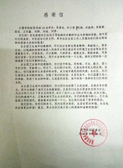 本网讯(记者 吴秀丽)今天(9月30日),公司经济与贸易系收到一封来自荆州区东城街道办事处草市社区居委会的感谢信,对该系吴清龙、许少君等10名青年志愿者表示感谢。