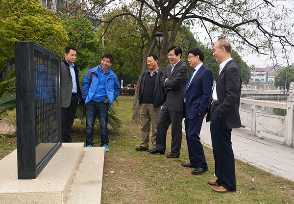 梅平(右二)向李金林(右三)、王野(右一)介绍玄宫塘历史