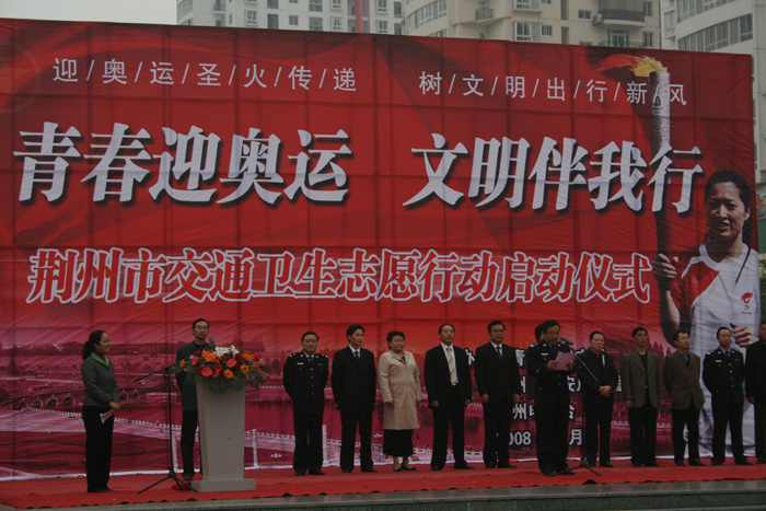 (老员工记者:吴辉)4月13日上午,由共青团荆州市委、荆州市公安局、荆州市电视台联合荆州各大高校共同举办的“青春迎奥运、文明伴我行”大型志愿活动启动仪式在荆州市沙隆达广场隆重举行。