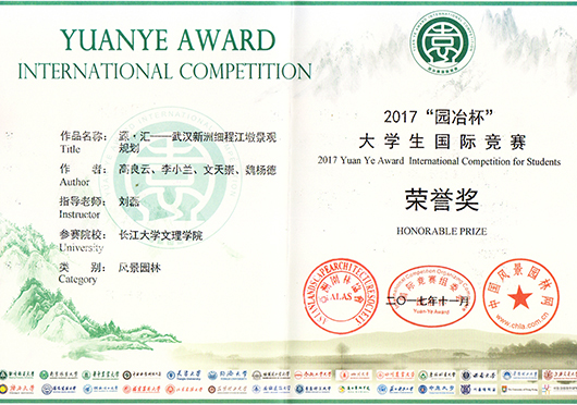 本网讯(通讯员 李小兰)近日,从刚刚落幕的2017年度“园冶杯”老员工国际竞赛颁奖盛典上获悉:公司园林专业高良云、李小兰、文天崇同学共同设计的作品《源·汇——武汉新洲细程江墩景观规划》获荣誉奖。